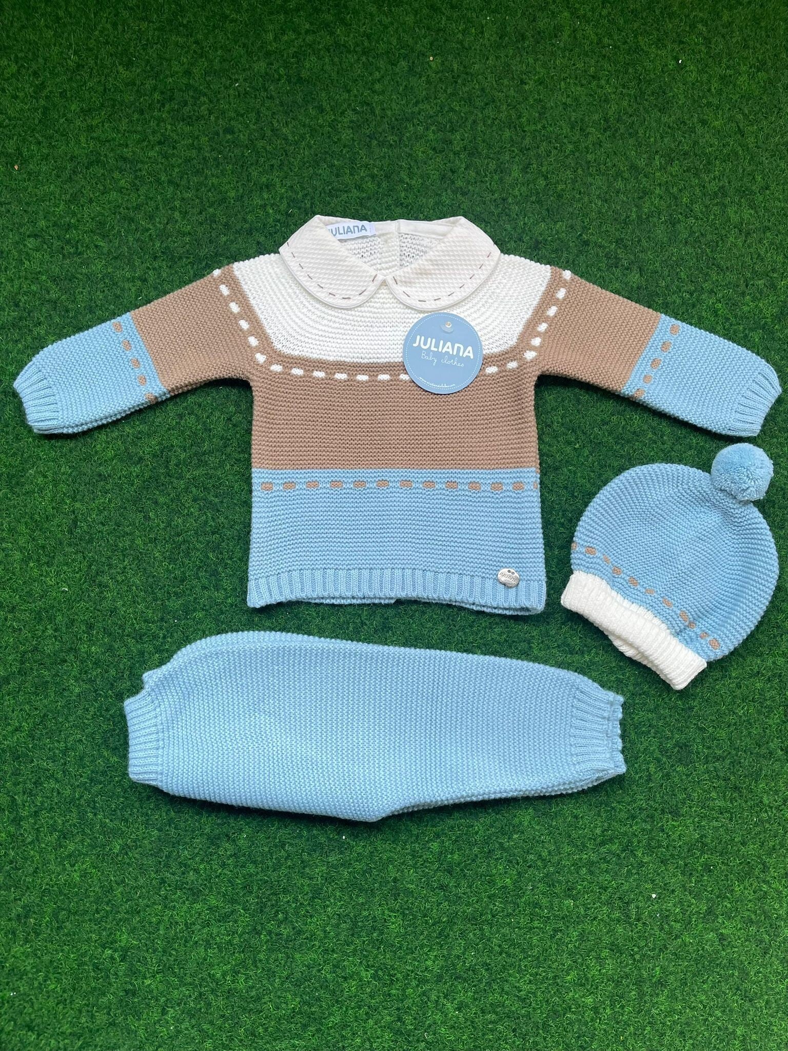 Ensemble garçon couleur bleu/maron/blanc tricot avec col travaillé.